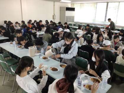 朝が早かったのでお腹がすきました。みんなで熱々のカツカレーを食べました。おいしかったです。