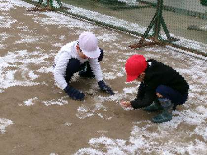 今日は朝から雪が降り、うっすらと雪が積もりました。休み時間には、雪で遊ぶ子どもたちで、運動場は大賑わいでした。運動場の雪を手ですくう子や木に積もった雪を集める子など、今年初めての降雪に大喜びでした。「もっと雪が積もるといいな」子どもたちの声があちこちから聞こえてきました。
