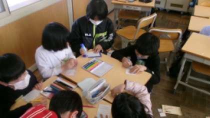 5時間目のなかよし活動では、たて割りグループごとに6年生を送る会の準備をしました。