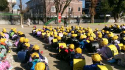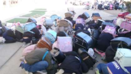 今日は、下校時の避難訓練を行いました。下校時に地震速報を聞いてシェイクアウトの姿勢をとり、身を守りました。その後、運動場に集まり、地震が起来た時、自分の命を守る方法を考えることの大切さについてお話を聞きました。