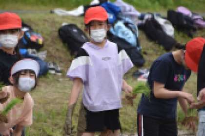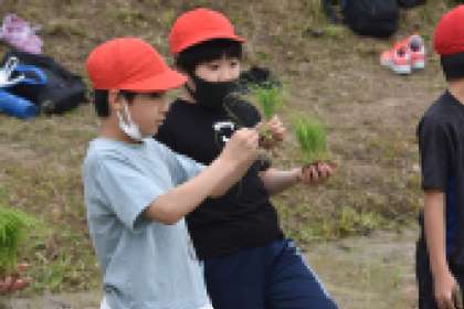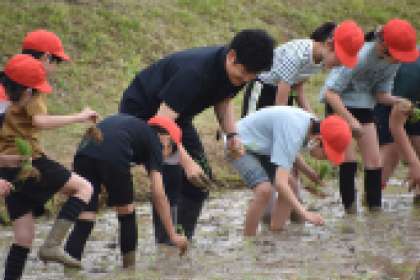 JAの方に教えていただきながら、田植えの体験をしました。田んぼに入るときも「わー」「きゃー」とか「冷たい」「ぬるい」「ぬるぬるする」と、思い思いの反応を口にしていました。泥の中を歩き、たくさんの苗を植えることを楽しみながら、時間をかけて植えることで、お米を食べられるありがたさを感じたことと思います。これから稲の成長が楽しみです。