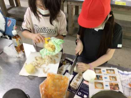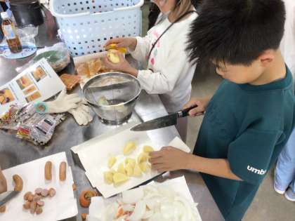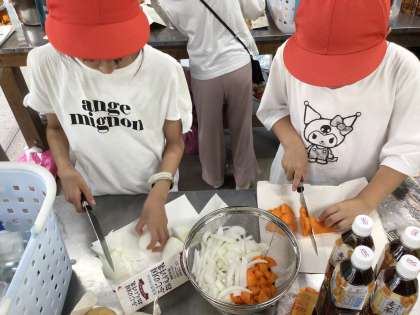 包丁でカレーの具材を切っています。指を切らないようにね。