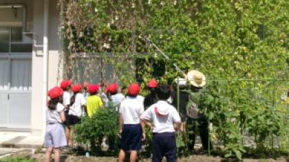 毎日暑い日が続いています。子どもたちは暑さに負けず、元気に学校生活を送っています。先日、学校の花壇で育てたひょうたんを収穫しました。子どもたちは、ひょうたんを切る瞬間をじっと見守っていました。落とさずに収穫することができたかな。
