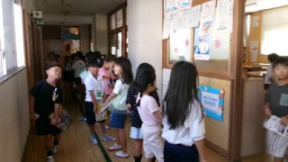 暑さ指数が高い日は、休み時間に室内で過ごします。図書室前の廊下は本を借りる児童で長い列ができました。本が好きな子がたくさんいます。