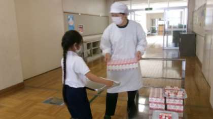 給食の時間は、冷えた牛乳が学級に届くように、給食開始の時間に合わせて配膳員さんが各階で牛乳を手渡ししています。牛乳係さんが、冷えた牛乳を学級に運んでいます。