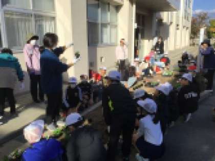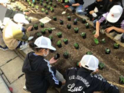 栽培委員が地域ボランティアの方と一緒に花の苗を植えました。植え方を教えてもらいながら、大きくなって花を咲かせてほしいという願いを込めて植えました。