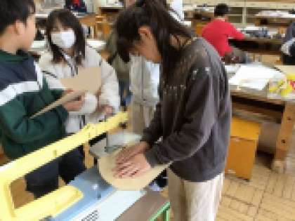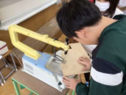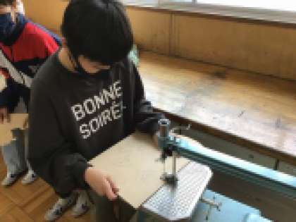 5年生は図画工作の時間に電動糸のこぎりを使ってオリジナルの伝言板を作っています。下書きの線に沿って、板を切っていく作業は集中しないといけません。切り終えると色塗りが始まります。