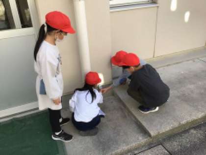 3年生は理科の学習で「太陽の光」について勉強しています。鏡を使って、太陽の光を壁にあてて、明るさや温度を調べています。