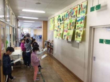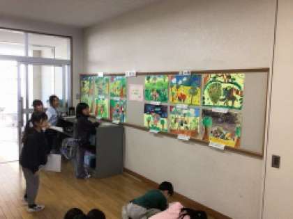 2年生が図画工作の時間に読書感想画の鑑賞をしました。友達の作品をよく見て、いいなあと感じたところを文章で表現しました。