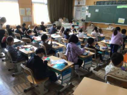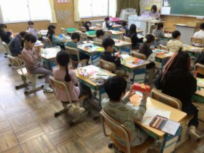 1年生は図画工作の時間に、スルスルビューンというおもちゃを作っています。先生の作り方の説明をよく聞いてから作業を進めます。さて、どんなものができるかな?