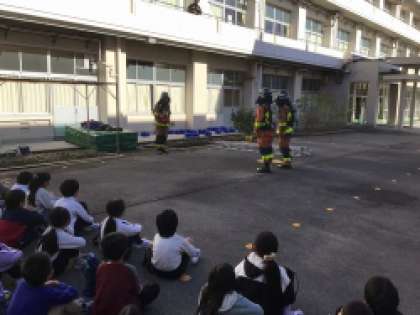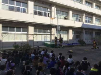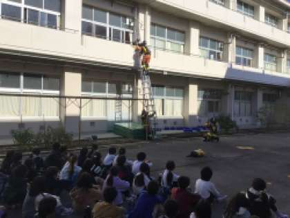 人命救助をする消防署隊員の姿を見学しました。はしごを設置して2階に取り残された人を助け出しました。