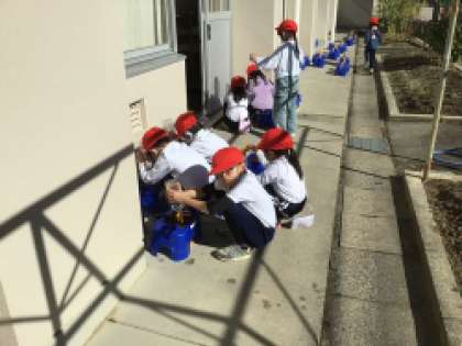 チュリップの球根を植えた1年生。「大きくなあれ」と願いながら水やりをしています。寒い冬がやってきますが、1年生のあたたかい気持ちがチュリップを大きくしてくれると思います。