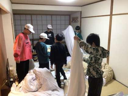 起床し布団を片付けています。朝の検温を済ませたら、部屋点検です。