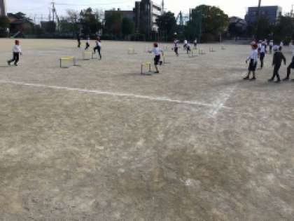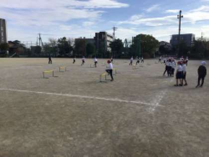 3年生が体育の授業で小型ハードルを跳んでいました。跳ぶだけでなく走ることも大事になります。スピードを緩めずリズムよく走り切れるようになるといいですね。