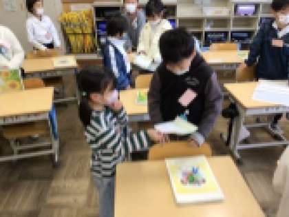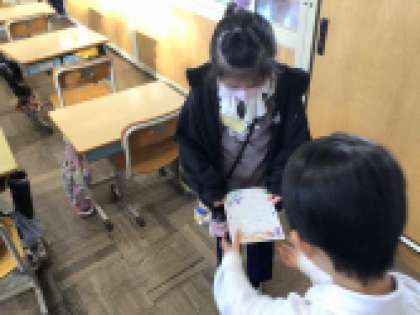 11月におもちゃ教室が行われ、2年生が1年生におもちゃの作り方を教え、一緒に遊びました。そのお礼に1年生が2年生に手紙を書きました。2年生は1年生から手紙を手渡されうれしそうでした。