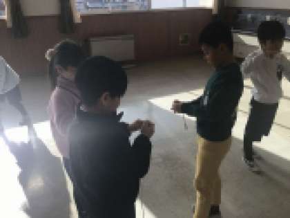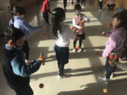 1年生は地域の方から昔遊び(お手玉・こま・おはじき・けん玉・あやとり・折紙)を教えてもらいます。地域の方が来てもらう前に、けん玉とこまを練習していました。うまくいかない時は友達同士で教え合っていました。