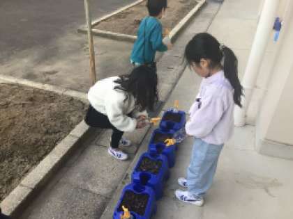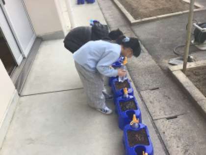 1年生が愛情をこめて育てているチューリップの球根から芽が出始めました。寒い中、水やりを忘れずに取り組む姿は立派です。