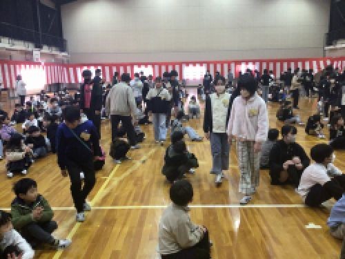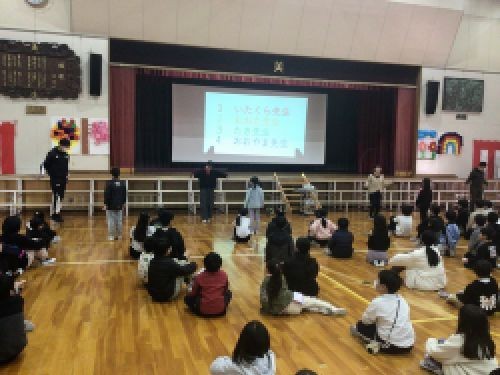 6年生を送る会の第1部では、1、2年生が行い、なかよし班の6年生とゲームやクイズをして楽しみました。クイズでは、6年生の担任の先生が登場し盛り上がりました。