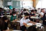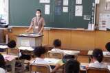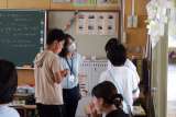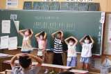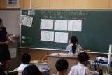 国語でドリルを使って漢字の練習をします。係の子どもたちが前に出て、みんなの練習...