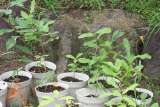 バケツ稲の横で、5年生が植えたどんぐりも順調に育っています。大きな木になるのは...