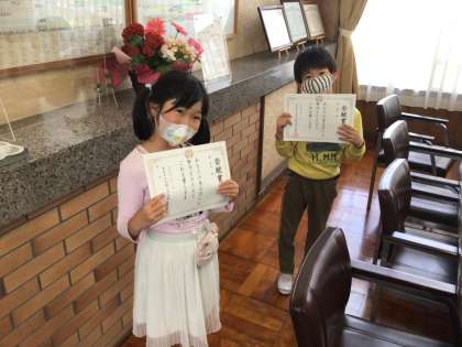 子どもたちに若鯱賞を手渡すのも本日からスタートしました。今日の若鯱賞は、2年生2名、6年生3名に渡しました。