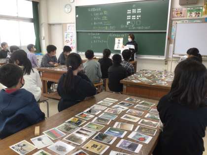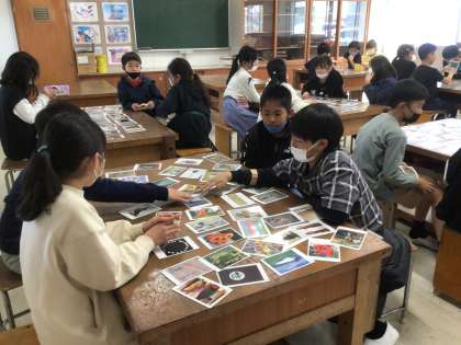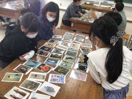 お題の「美しい」「静か」などに合わせたカードをそれぞれ選び、選んだ理由を班の子と共有しました。