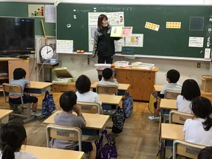 本校では、一部の曜日をのぞいて、給食の時間と清掃の時間の間に帯学習の時間を設定しています。水曜日の今日は、YYタイムをしています。教科の学習でも大切となる、友達と意見をかかわらせながら考える力を高める時間です。3年生の教室では、「無人島に持っていくなら何」をテーマに、肩に力を入れず気楽な気持ちで話し合っていました。1年生の教室では、担任による読み聞かせとその後の感想交流を行っていました。