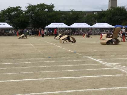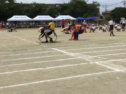 高学年の競争遊戯「仲間を信じて進め」が進行中です。
