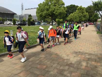 5月20日までの春の交通安全週間に合わせて、登校のタイミングで本校のPTA役員の皆様、子ども会役員の皆様に交通安全立哨をしていただいております。ありがとうございます。また今後、登下校時の熱中症が心配な時期になっていきます。そこで、教員による下校指導を行いました。そこで、こども110番の家や通学班ごとで水分補給ができる場所(給水ポイント)の確認をしました。給水場所を提供くださっている皆様にも感謝申し上げます。