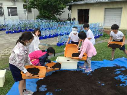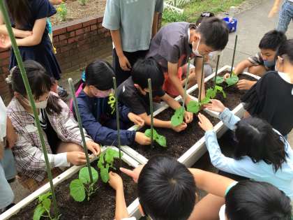 土の準備をがんばり、芽を出ししっかり育ったツルレイシの苗を植えました。