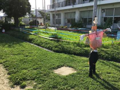 5年生は敷地内にある田んぼに植えた稲がどんどん大きくなってきました。田んぼにいる生物をねらう鳥たちなどに田んぼを荒らされないようにするため、手作りのかかしを設置しました。他学年児童が間違って田んぼに落ちてしまわないことも目的にしています。様々な目的をもち、自分たちで工夫しながら学びを進めています。