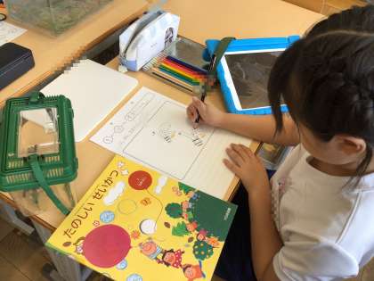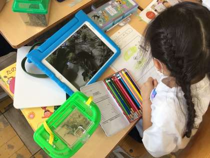1年生では現在、生活科で「いきものとなかよし」という単元を学習しています。先日、学校敷地内にある森、運動場隅の草むら周辺にいる生き物を探しました。あみで捕まえ虫かごで育てています。今日はその観察日記を書きました。学習用タブレットで生き物の特徴をとらえた写真を撮影し、それをもとにノートに大きな絵を描きました。ずいぶん学習用タブレットの扱いにも慣れてきた1年生。こうした観察にも効果的に役立ててほしいです。