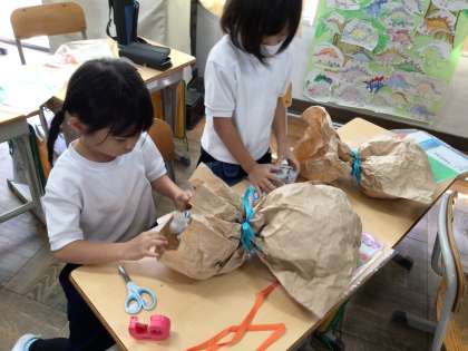 大きな紙袋を丸めたり、膨らませたりして、想像を膨らませながら動物やボールなどを作っていました。
