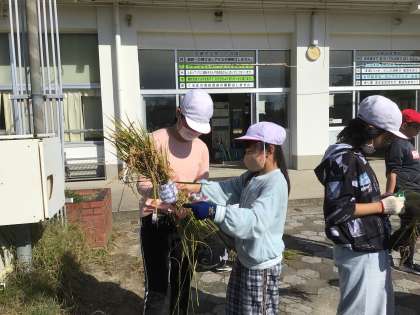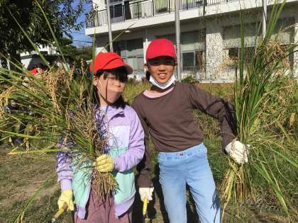 5年生が学校の田んぼで育ててきた稲の稲刈りを行いました。