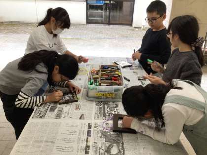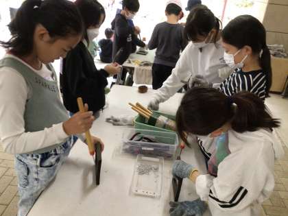 クラフトづくりとして、写真立てを作っています。木枠をバーナーで焦がし、磨いたあとにフックつけ、色づけをして完成させます。