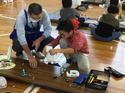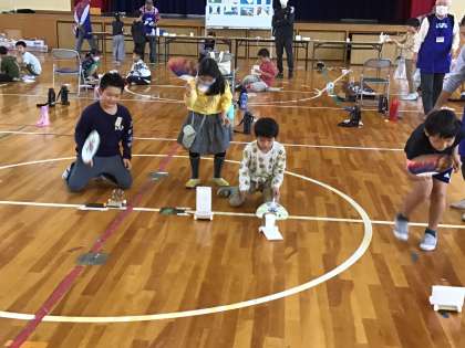 今日の午前、3年生がものづくりサポートセンターの皆さまを講師にお迎えして、「風で動く車 ものづくりプログラム」に取り組みました。紙皿やプラスチックコップなどお家にある道具を活用して、うちわやサーキュレーターの風で進む車づくりに挑戦しました。広い体育館いっぱいに車を走らせました。