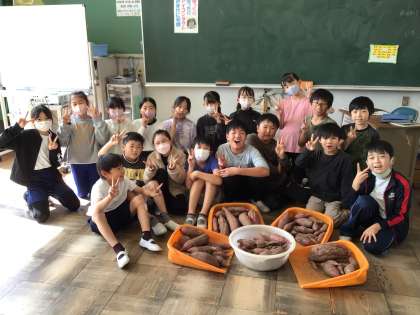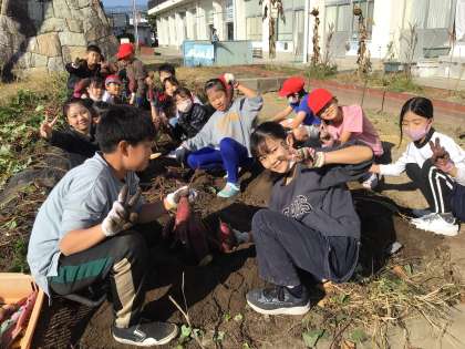 4年生 芋ほり その1 公開日 2023/11/02 更新日 2023/11/02 各学年から 5月に苗をさした芋を収穫しました。大豊作で、みんなで力を合わせて、土の中から掘り出しました。 喜びの種をまいたことが、みんなの素敵な笑顔につながりました。