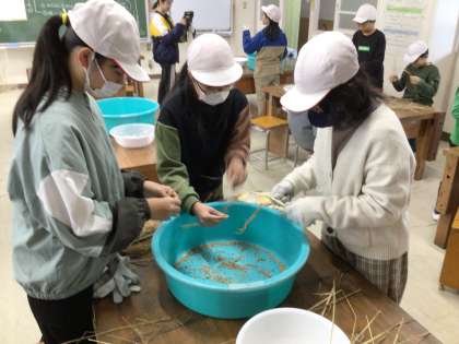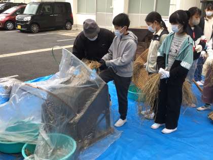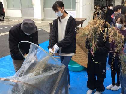 5年生が今年度育て収穫した稲の脱穀を1・2校時に行いました。それぞれ交代で、割り箸を使ってはさんで脱穀したり、足踏み脱穀機を使ったりしました。脱穀作業の講師として、地域から中根さんが教えに来てくださいました。早朝より準備、指導をありがとうございました。
