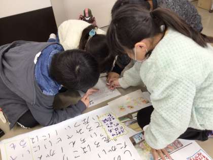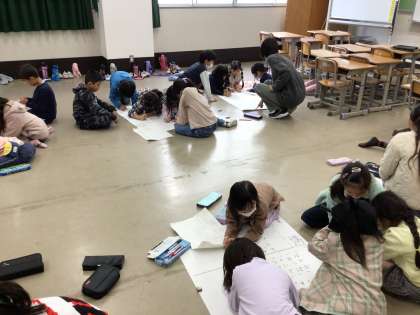 2年生生活科 発表新聞づくり 公開日 2023/11/20 更新日 2023/11/20 お知らせ 生活科の学習では、町探検のまとめを進めています。 先日のオープンスクールの際は、町探検のグループ発表新聞の下書きを話し合ったり、書いたりしました。下書きができたら、次は模造紙に書いています。 子どもたちは言葉を書いたり、撮ってきた写真を貼ったりして、学んだことが少しでも伝わりやすくなるよう、工夫して作っています。