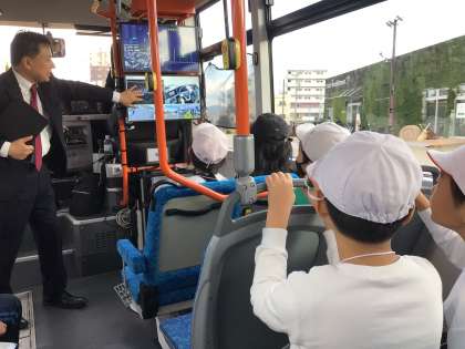 今日の午後、明日から豊田市で始まる自動運転車両乗車体験会の前日試乗に出かけました。様々な報道機関に公開する貴重な日に、豊田市未来都市推進課の方よりお声かけいただき、実際に乗車体験をすることができました。レベル4段階で、一部は運転手の手動運転となりますが、自動モードでも滑らかにスタートし、ぎこちなさは全くありませんでした。5年生も全員が乗車し、その心地よさを体感しました。
