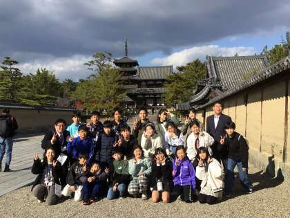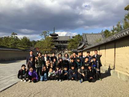 現在、午後1時40分。法隆寺に到着しました。クラスごとに写真を撮りつつ歴史的建造物を見学しています。
