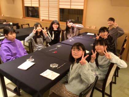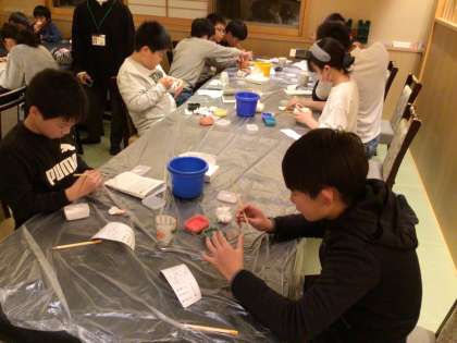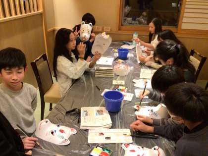 夕食と入浴を済ませ、現在はものづくり体験を行なっています。内容は、念珠づくり、狐面絵付け、湯呑みやガラスコップへの絵付けなどです。どんな作品ができあがるかお楽しみに。