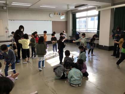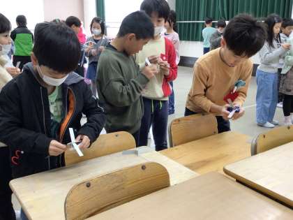 2年生生活科 紙とんぼづくり 公開日 2023/12/07 更新日 2023/12/07 お知らせ 生活科「つくる楽しさはっけん」の学習が始まりました。 身近なものを使ったおもちゃ作りを通して、自分の思い描いたおもちゃを作るための工夫や、オリジナルの遊び方を考えていきます。 また、1月には1年生を招いておもちゃで遊ぶ会も実施する予定です。 6日は、導入とし学年全員で紙とんぼ作りを行いました。