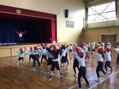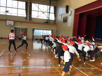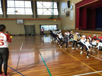 トヨタ自動車所属の女子ソフトボールチーム「レッドテリアーズ」から、4名の選手が「ソフトボールを使った運動」の講師として来校し、子どもたちにボールの投げ方などを教えていただきました。