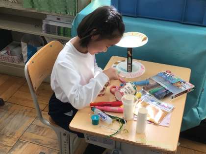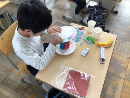3校時に1年生教室に行きました。この時間は2学級とも図工の授業です。今日は、「かみざらコロコロ」という単元名で、転がる仕組みを使って紙皿を用いた作品を製作していました。のりやテープでくっつけ、色塗りやお絵描き、飾り付けをしていました。