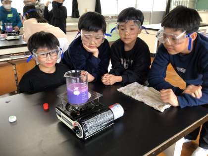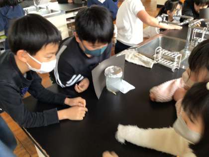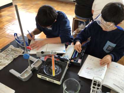 金属、水、空気の温まり方。見えない温まり方を、ロウの溶ける様子、サーモテープ、サーモインクの色の変化、線香のけむりの動きで、見える工夫をして実験して調べました。