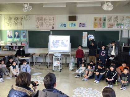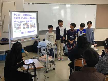 4年生の発表は総合的な学習の時間で1年かけて学習してきたエコの内容です。3Rをはじめ学んだ知識と学校生活で生かして実際に取り組んでいること、今後の課題などを発表しました。自分たちで作った和紙の展示、エコカルタで保護者の方と一緒に楽しみました。