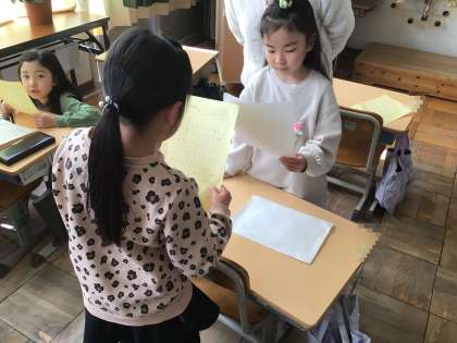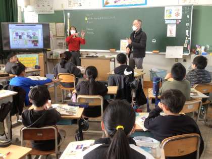 今日の3校時に授業風景です。1年生教室では、算数で学習している時計を読む練習をしていました。ペアになって、時計がたくさん並んだプリントを見ながら、長針と単針の位置を見て次々に答える練習をしました。2年生教室では、おへその秘密について学習しました。お母さんのおなかの中でどのように栄養を受け取り、成長していくかを2年生なりに学びます。5年生教室では、英語のALTの先生と一緒に、英語を通して日本文化について学びました。歌舞伎や空手、着物など様々な単語が飛び交っていました。