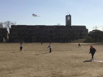 1年生では、生活科「冬となかよし・風となかよし」の単元で凧を作りました。思い思いの絵を描き、今日の青空の下で凧揚げをしました。風にのって高々とあがる凧もあれば、糸が引っかかってほどくまでに時間がかかることもありました。この後、家庭に持ち帰りますので、公園等で安全に遊んでくださいね。