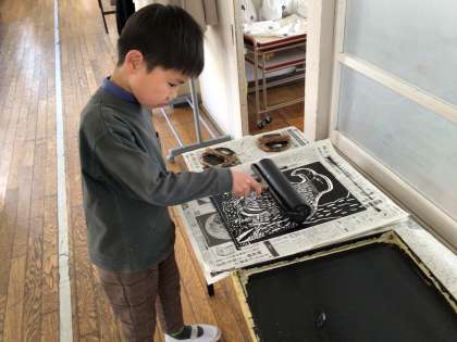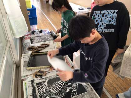 彫り上がった版画を刷りました。紙を上げると、わあ!と嬉しさと驚きの声が上がりました。